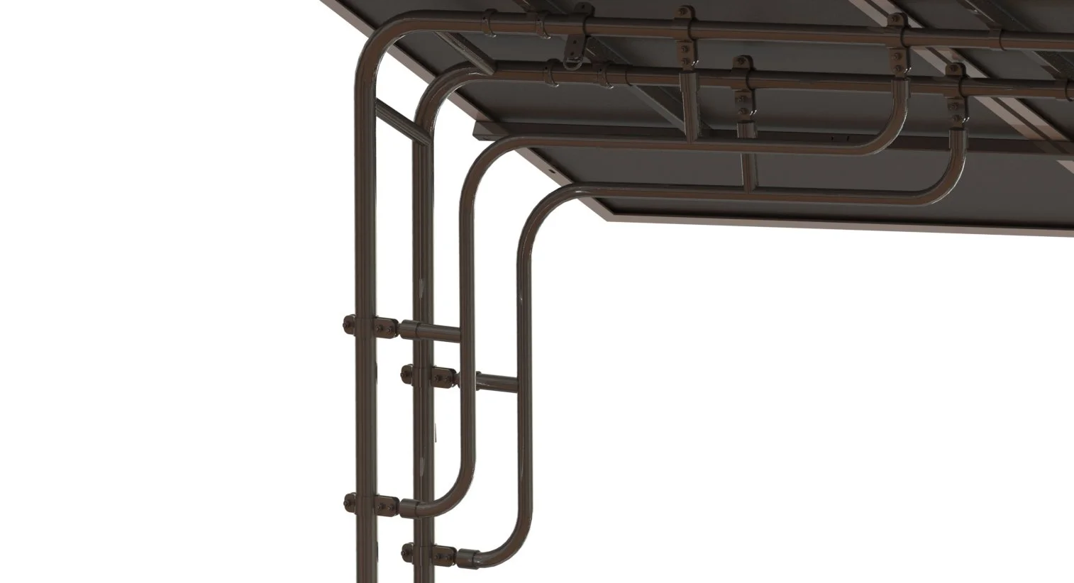 This is a new accessory for hanging a paddle surfboard above the Eolios Arch using ring-shaped supports. Above these are cross tubes for attaching solar panels.