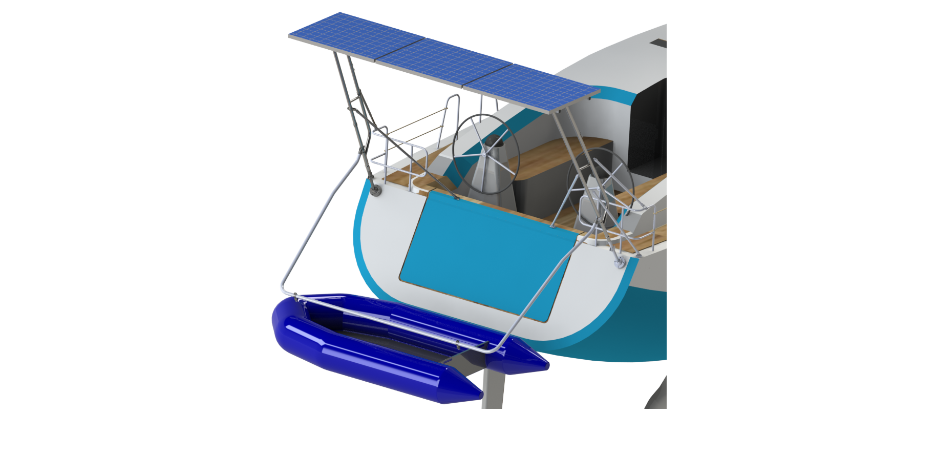 This is a 316L stainless steel arch with a Ø35mm tube (the same as the Eolios Arch tube). It acts as a davit for hoisting the dinghy. The two advantages of this system are: it retrieves the dinghy away from the transom and it is hoisted with a single line connected to a winch.